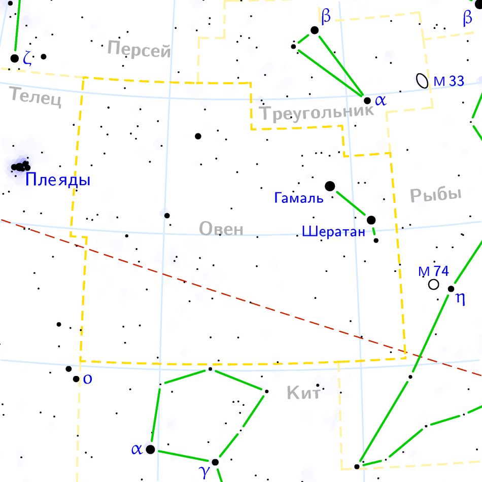 Южном полушариях с сентября по февраль. Голова Овна отмечена первой яркой