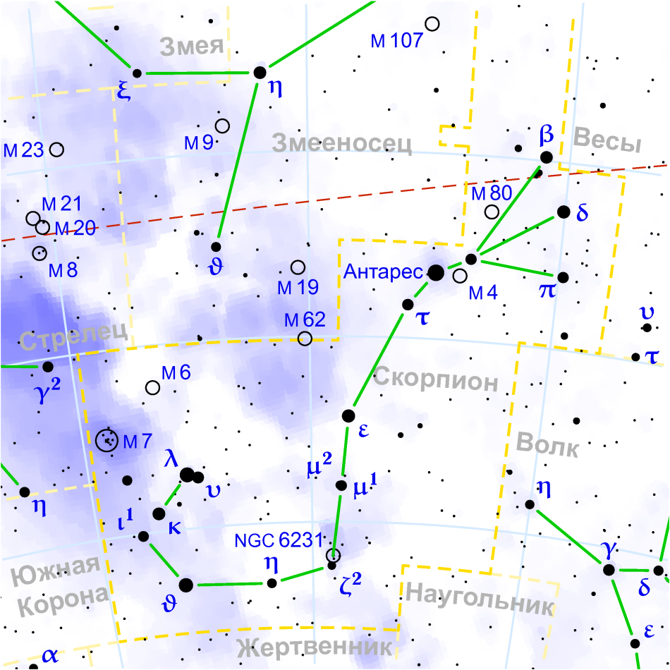 Звезда Антарес, красный сверхгигант, обычно считается сердцем Скорпиона. Греки назвали её Антарес, что означает “соперник Марса”, вероятно, потому, что планета имеет такой же красный оттенок. Считается, что она в 700 раз больше Солнца в диаметре и в 9000 раз ярче.