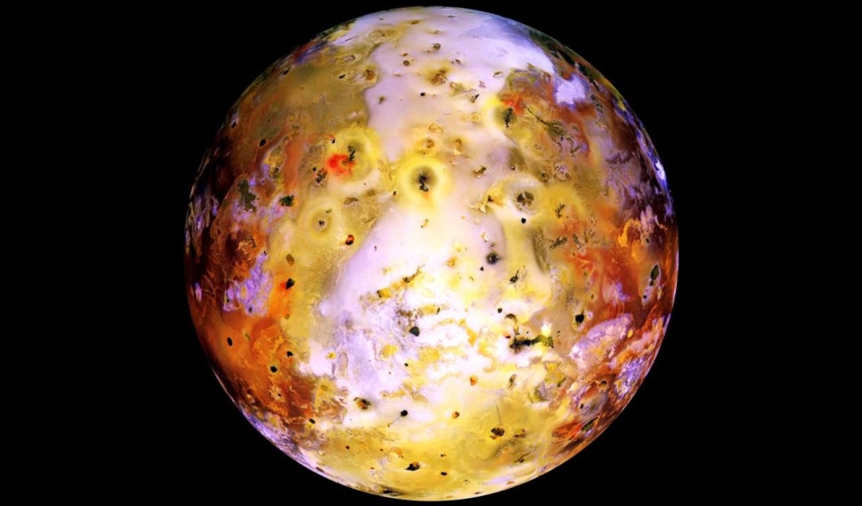 Ученые полагают, что Ио имеет расплавленное ядро из железа и сульфида железа, окруженное расплавленным скалистым средним слоем, называемым мантией. Яркая поверхность спутника Ио покрыта вулканами, лавой и отложениями серы в различных формах. Сера придает Ио его яркий желтоватый цвет, наряду с его меньшими участками красного, оранжевого и черного. Считается, что белые участки на его поверхности - это в основном твердый диоксид серы.